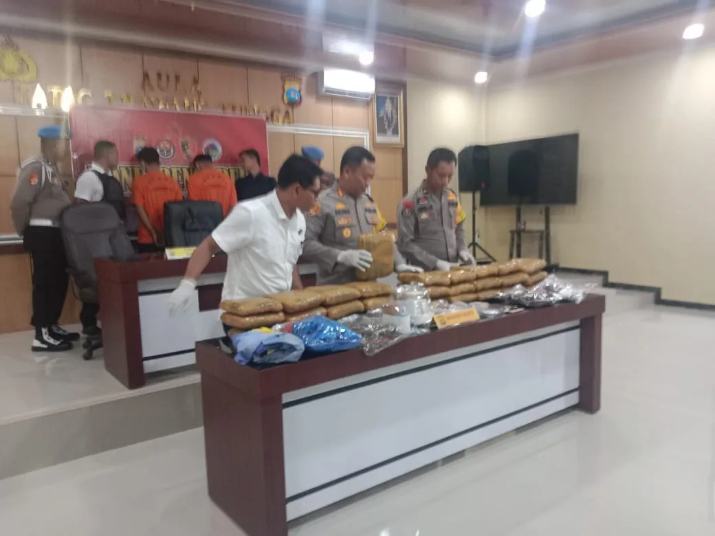 Pasbar | AndoraNews : Dua pelaku kasus Narkoba yang memiliki 30 Kg ganja kering dan sabu terungkap, saat Kapolres Pasbar memimpin acara Press Release ungkap pelaku tindak pidana narkotik di wilayah hukum Polres Pasbar yang berlangsung di Aula Mapolres Pasbar pada hari Rabu, (13/11/2024). narkoba