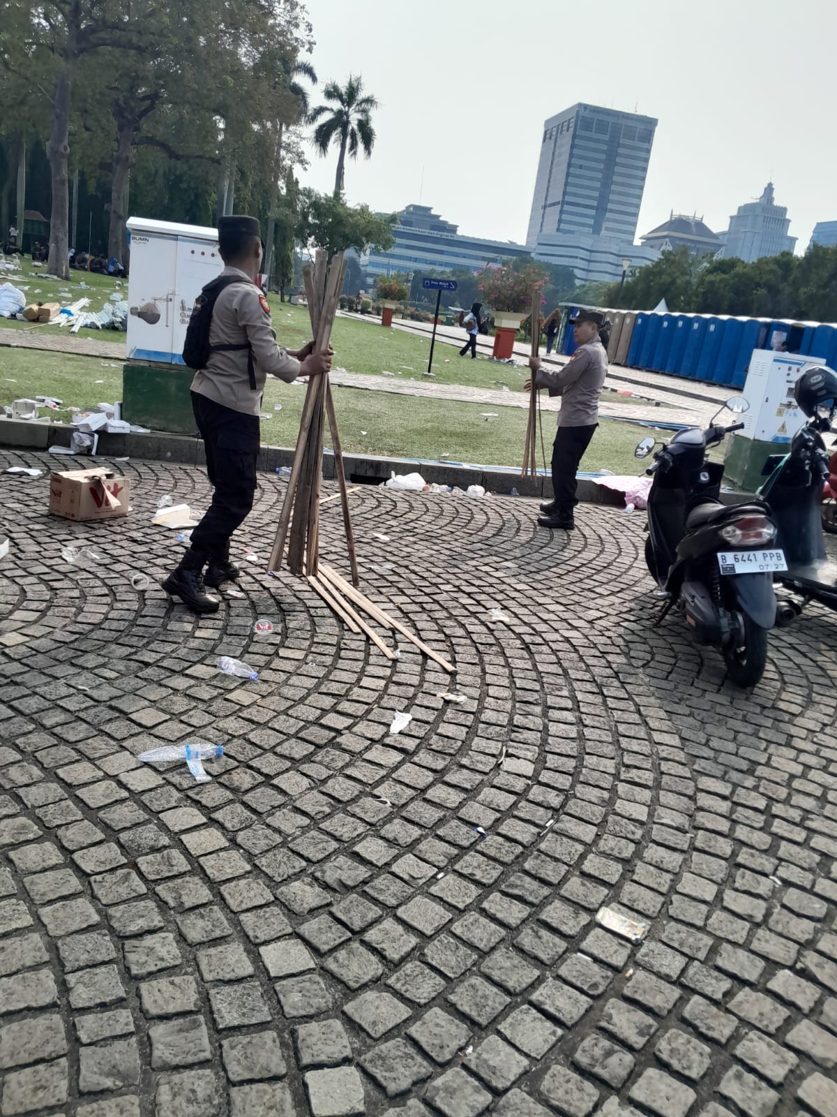 Aksi bersih-bersih ini dilakukan oleh sekitar 100 personel dari Polda Metro Jaya, termasuk jajaran Polres Metro Jakarta Pusat dan Polsek Tanah Abang. Mereka bekerja bahu membahu dengan petugas kebersihan untuk memastikan kawasan Monas kembali bersih dan nyaman.