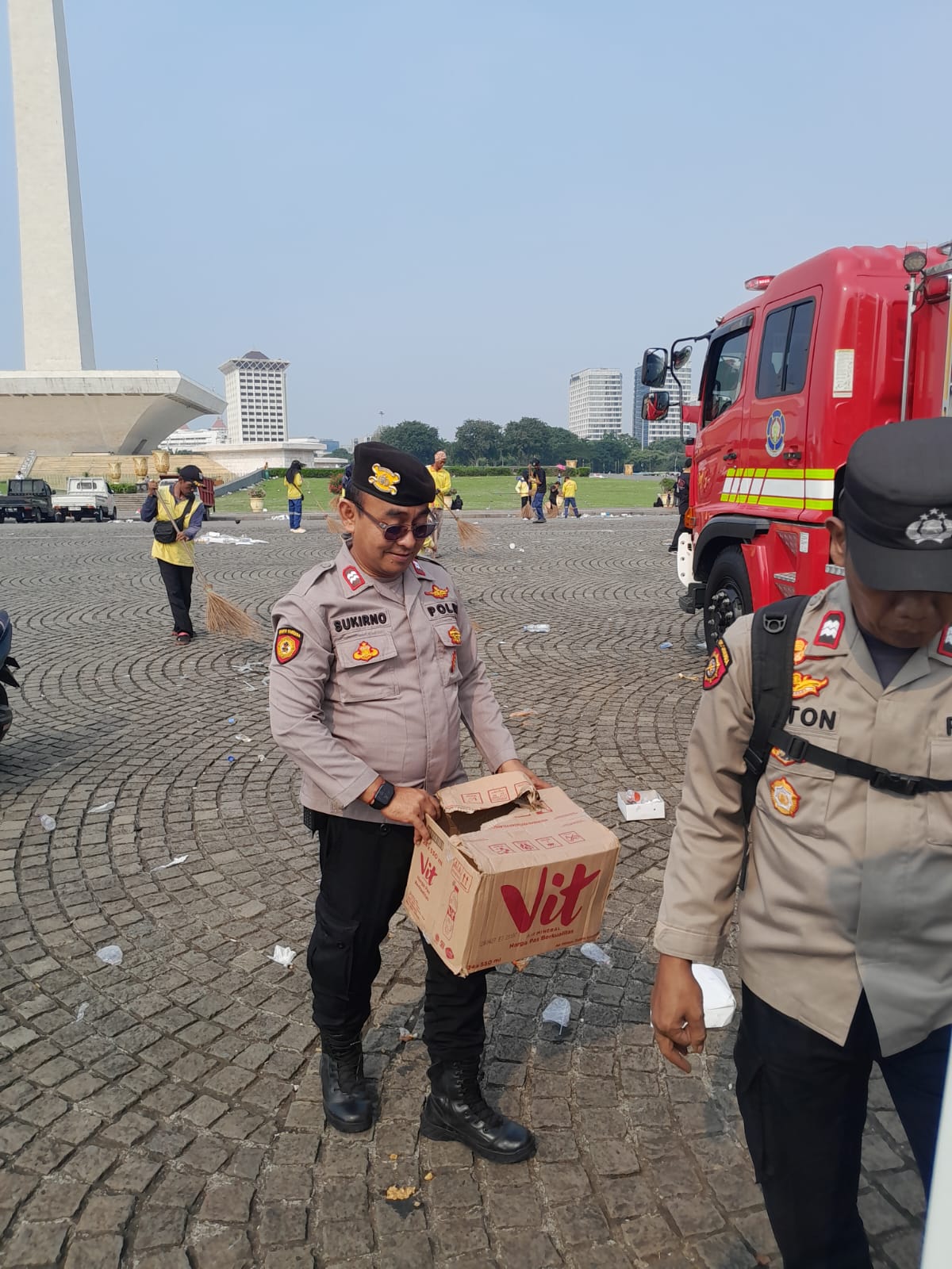 Aksi bersih-bersih ini dilakukan oleh sekitar 100 personel dari Polda Metro Jaya, termasuk jajaran Polres Metro Jakarta Pusat dan Polsek Tanah Abang. Mereka bekerja bahu membahu dengan petugas kebersihan untuk memastikan kawasan Monas kembali bersih dan nyaman.