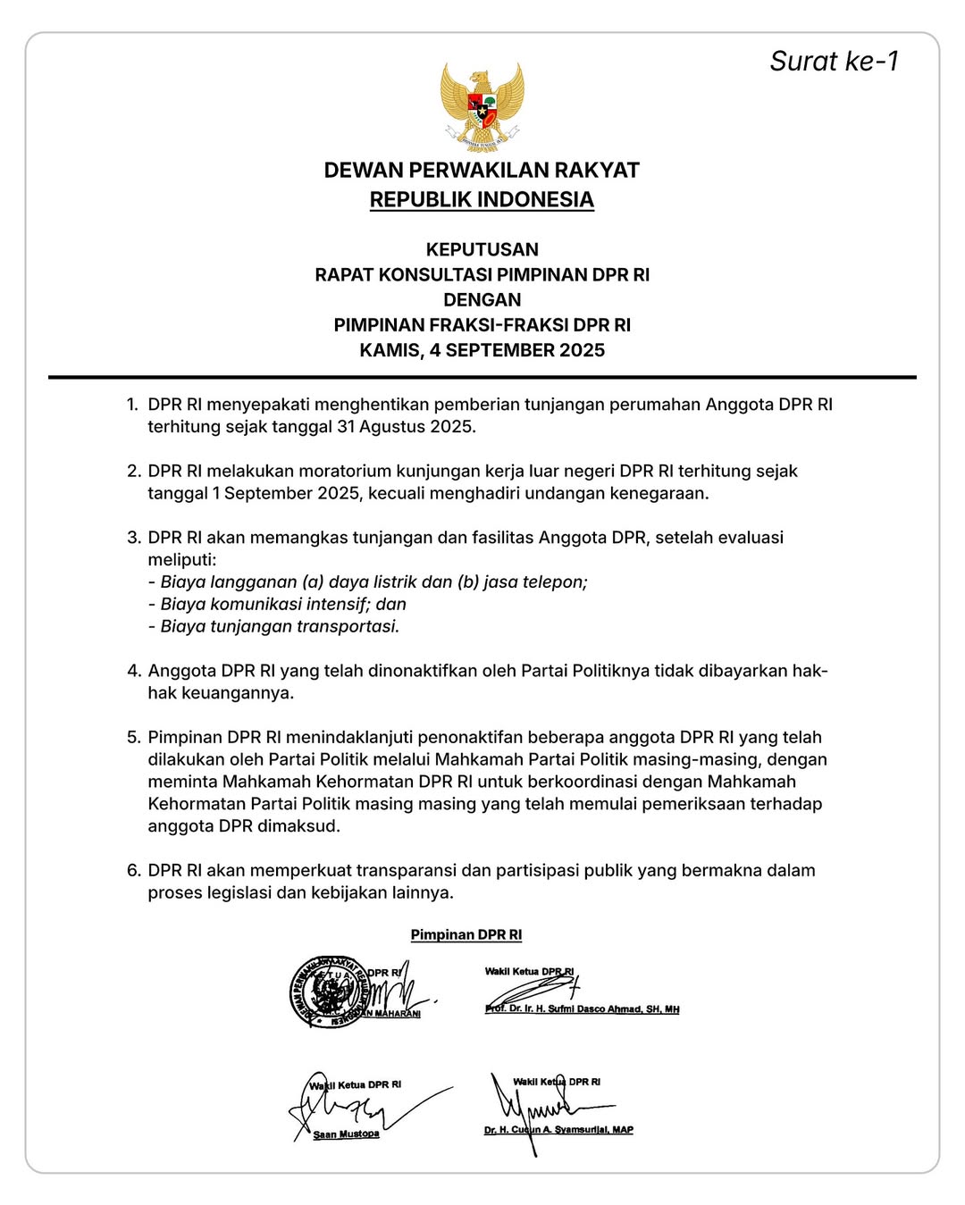 - Moratorium kunjungan kerja luar negeri mulai 1 September 2025, kecuali undangan resmi kenegaraan.