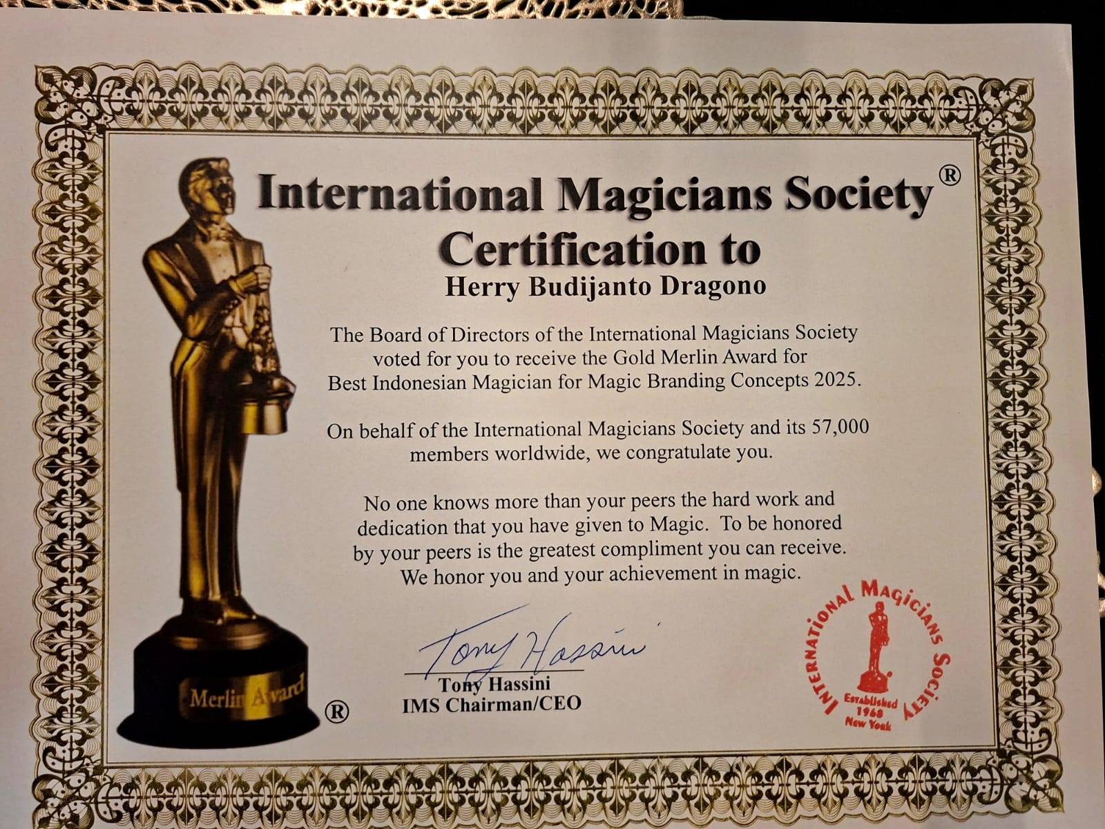Penghargaan paling prestisius di dunia sulap ini diberikan langsung oleh CEO International Magician Society (IMS) New York, Mr. Tony Hassini, pada Sabtu, 8 November 2025.