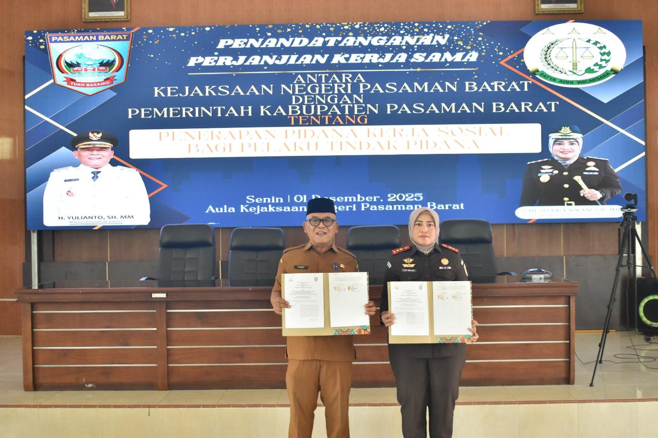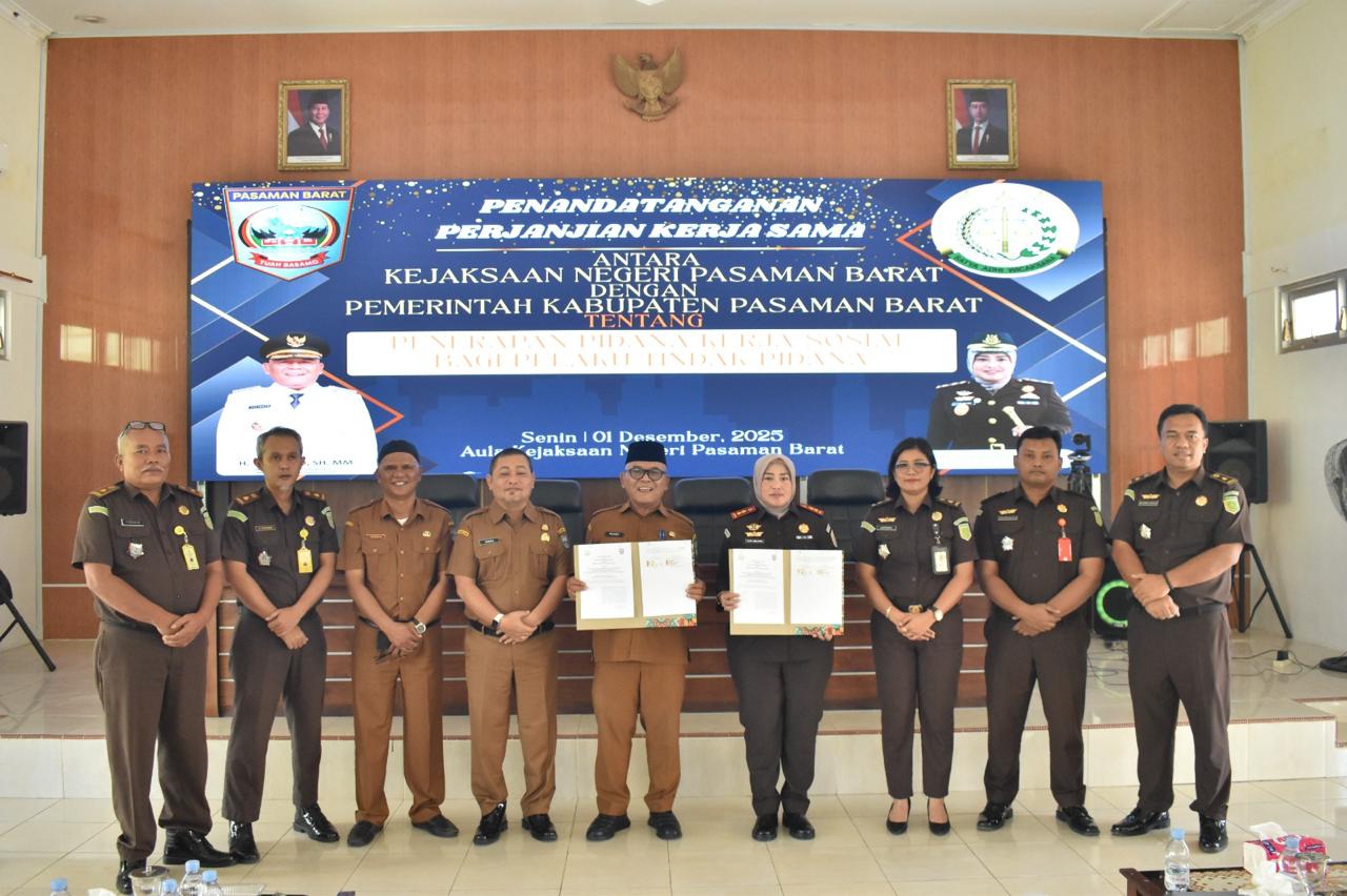Pasaman Barat | AndoraNews: Kepala Kejaksaan Negeri Pasaman Barat, Tjut Zelvira Nofani, SH., MH., pada hari Senin (1/12) resmi menandatangani Perjanjian Kerjasama (PKS) dengan Bupati Kabupaten Pasaman Barat, Yulianto, SH., terkait penerapan pidana kerja sosial bagi pelaku tindak pidana. Penandatanganan ini merupakan langkah strategis dalam mengimplementasikan program pemidanaan alternatif yang saat ini diatur dalam Undang-Undang Nomor 1 Tahun 2023 tentang Kitab Undang-Undang Hukum Pidana Nasional. Kejaksaan