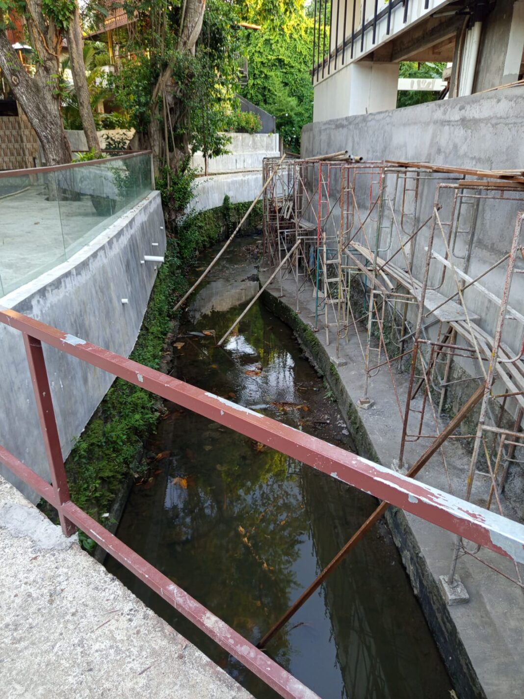 Dari pantauan visual, area pembangunan tampak cukup luas dan masih dalam tahap pengerjaan. Pada titik yang ditandai sebagai “Pura Pejuang ”, terlihat indikasi penyempitan aliran sungai akibat aktivitas konstruksi yang berada terlalu dekat dengan badan sungai.